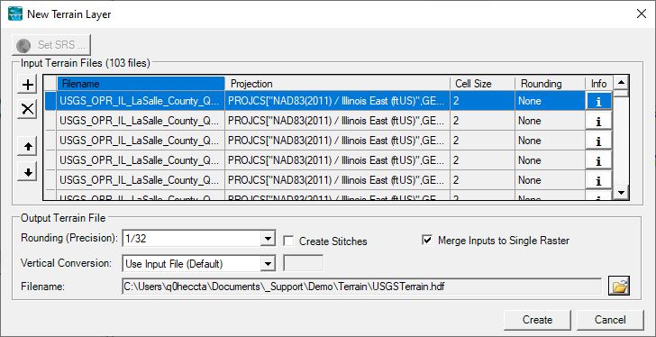 Filename is used to set the name of the Terrain Layer shown in RAS Mapper – “Terrain” is the default name. A HDF file will be created that has information on what raster data are part of the Terrain Layer as well as information for merging information from adjacent rasters. A second file with the VRT extension will be created. The VRT file is a visualization file allows for displaying multiple rasters at once using the same symbology with just the one VRT file in a GIS.