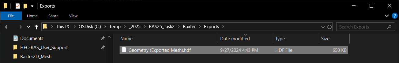 A file will be created and written to the project directory into the Exports folder. The file will have the geometry name appended with (Exported Mesh).hdf.