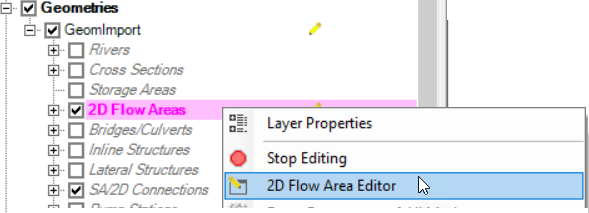 - Right-click the 2D Flow Areas layer and choose the 2D Flow Area Editor menu item