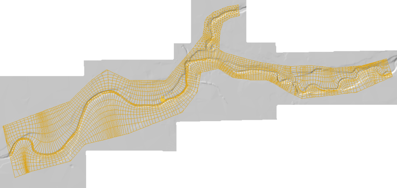 The first step is create a mesh in HEC-RAS 2025. The new tools are robust and complicated. They allow you flexibility to create cartesian, quadrilateral, and triangular meshes with simple editing tools (more on editing tools). Learn more about meshing tools here and watch a short video here. Below is an example mesh created in HEC-RAS 2025.