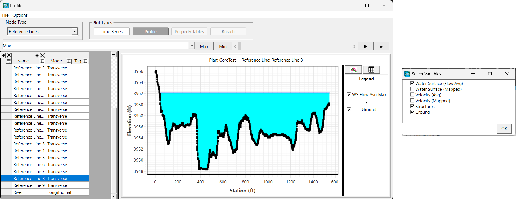 An example Profile Plot (Cross Section Plot) is shown for a reference line below. You can selection the Variables to plot from the Options menu. Note that there is an option to plot the flow-averaged water surface or the mapped water surface.