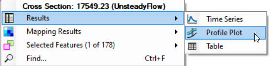 For computed model results (that are not interpolated), you can use the structure of the geometry to query results. For 1D models, this means that the River, Cross Sections, and Storage Areas have results that can be plotted. Select the layer, right-click on the feature and choose the Results and then Results Time Series (Flow, Stage), Profile Plot (WSE, Velocity), or Table. For 2D models, the 2D Mesh is allows you to select various time series plots for the cell or cell face (discussed in detail, later). Below are an examples for different cross section plot options.