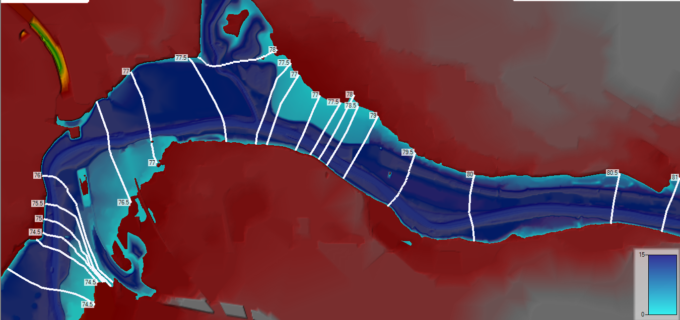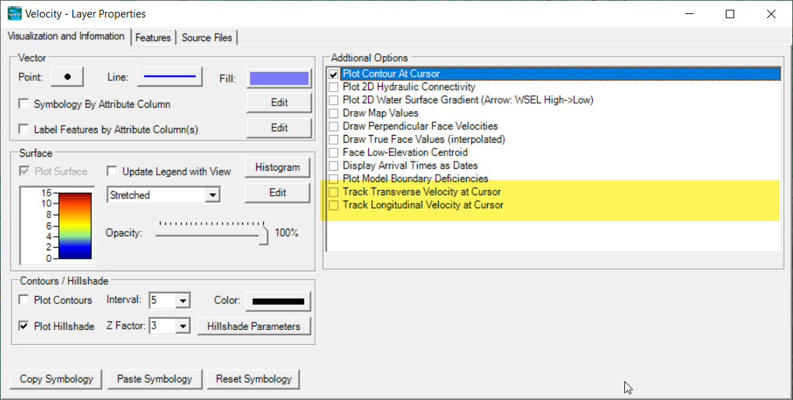 You can turn on interactive plotting of Contour Lines at the location of the Cursor for raster results. For Depth and WSE results, contouring by value using the Plot Contour at Cursor option. For Velocity results, generating contours perpendicular or longitudinal to flow.