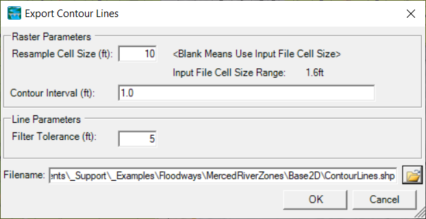 Contours can be created for all RAS Results and saved to a shapefile. To create contours, right-click on the result (e.g. WSE Layer) and select the Export Layer | As Contour Lines menu item. In the dialog provided, choose the raster resample cell size, contour interval, filter tolerance (to help reduce the number of point for each contour line for big datasets), and filename.
