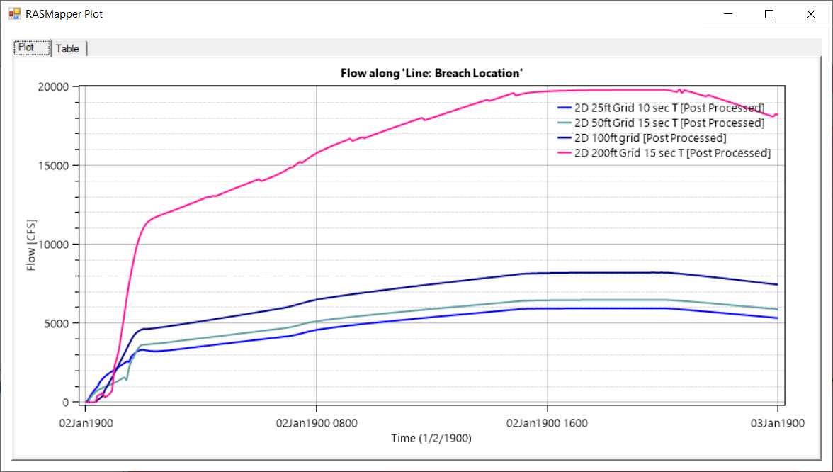 Time series information is also available for a profile line. Option to plot Flow, Volume Accumulation, and a Rating Curve are available. Positive flow is evaluated as flow passing though the line (away from the viewer) when looking at the line with zero-station on the left. An example plot comparing flow through a breach location is shown below.