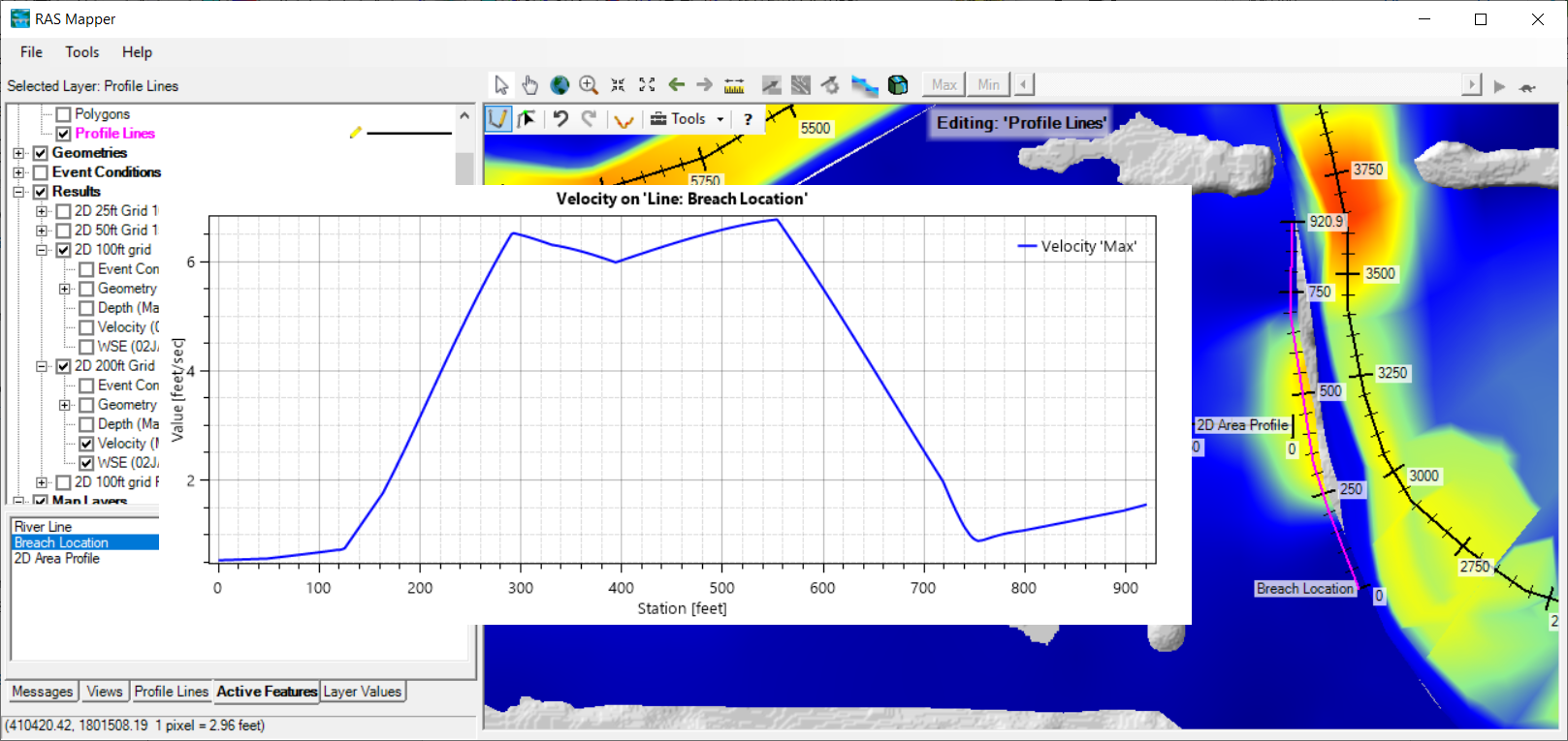 It is also convenient to have an idea where you are along a line. One of the Profile Lines layer plotting properties is the ability to turn on Stationing Tick Marks along the line. In the figure below, a plot of velocities near a breach location are shown along with the stationing along the profile line used to extract the velocity information.