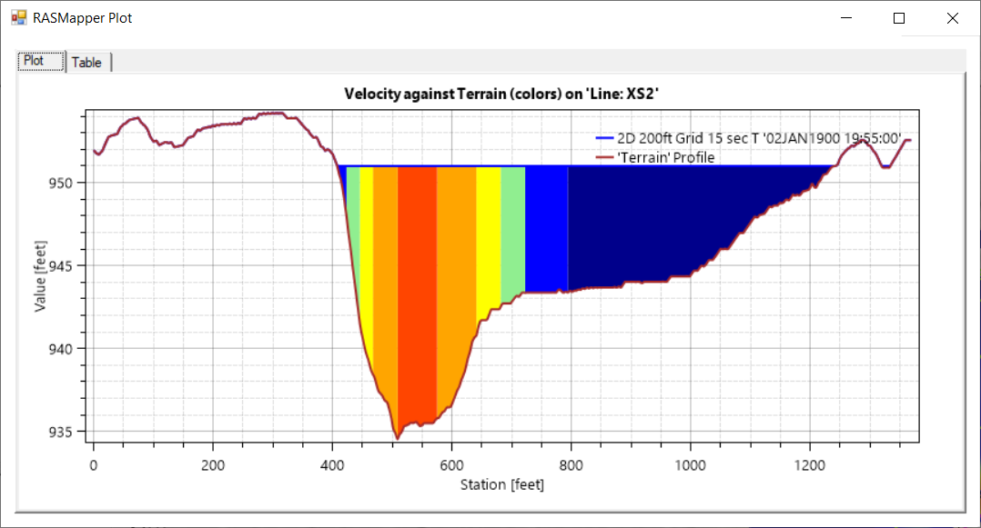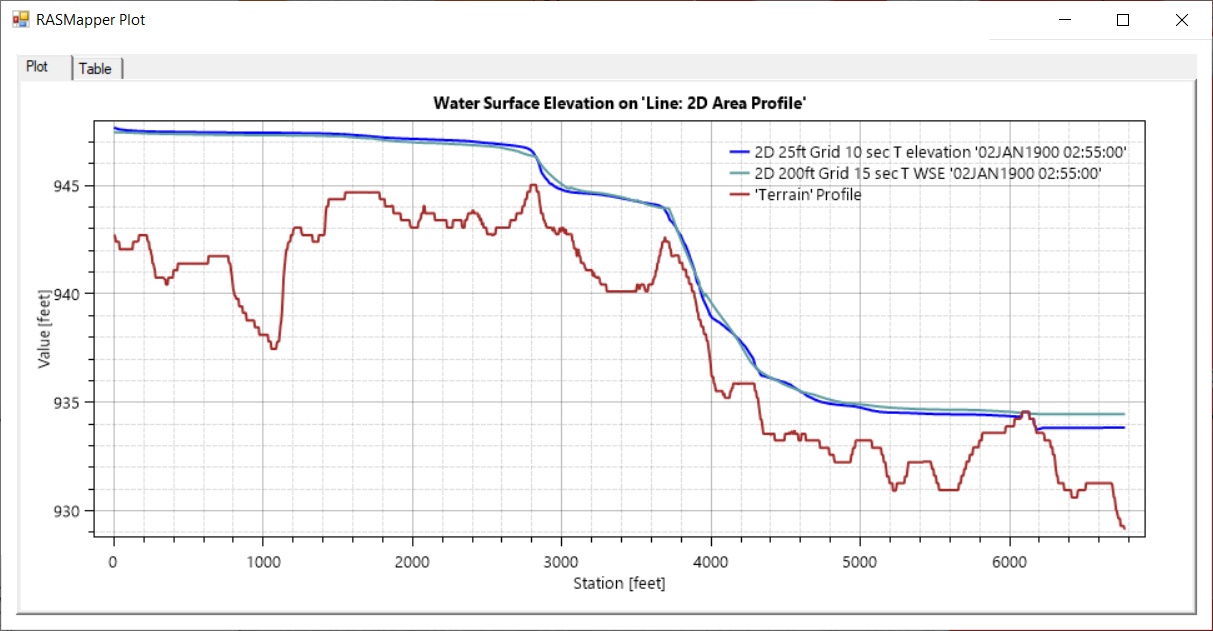 Plot Profile will allow you to create a plot underneath the line for a single mapping time step. Plot options are dictated by what Result layers are turned on in the Layer List (WSE, Depth, Velocity, etc.). There are plot options to plot the map values with and without Terrain. The profile plots are also linked to the animation tools, so you can move through the simulation window to evaluate results. When animating, the profile line and map layer will update. As shown in the figure below, multiple map layers of the same type can be plotted at the same time (so long as they are turned on). The data behind the plots are available for inspection by clicking on the Table tab in the plot.