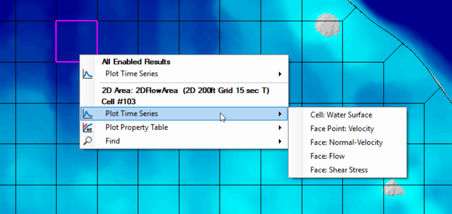 If the 2D Flow Area layer is enabled (turned on, you can see the mesh), as the mouse is moved over the map, the selected cell will be highlighted. A right mouse click provide access to simulation results (not interpolated) for the highlighted cell or cell face. Depending on the zoom level, the mouse will snap to the cell or face (zoom in more to snap to cell center). These computation values are what are used in the 2D hydraulic computations and are available under the Cell/Face Plot Time Series menu option. Available options are listed below.