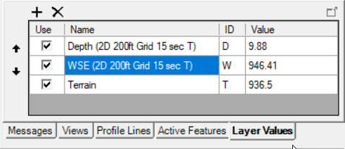 Add Watch to Layer Values. Each layer will be added to the Layer Values tab, shown below, in the lower left of the RAS Mapper interface. As you add layers, they will automatically be turned on, but you can establish the order you want to the reported values and you can specify the short ID tag next to each value. By default, the first letter of the layer name is used for the ID tag. The Layers Values list also allows you to Add and Delete layers to watch. If you would prefer, you can also