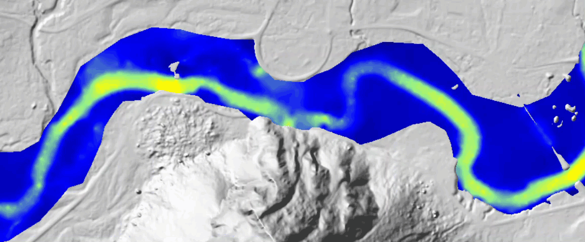 Every effort has been made in HEC-RAS to give the user a consistent interactive experience. However, because of the different data requirements for 1D and 2D modeling, the output options in RAS Mapper will depend on the model type. The simplest method for interacting with HEC-RAS results is to move the mouse cursor over the Map Window and a map tip with the interpolated value value for the Selected Layer with be displayed next the cursor. The selected layer will be highlighted in the Layer List and the name will be shown in the Map Window. The selected Profile will also be displayed ( upper right corner) in the Map Window. The number of decimal places used to show the value is controlled by the Display Output Decimal Places in the Global Settings | General options.