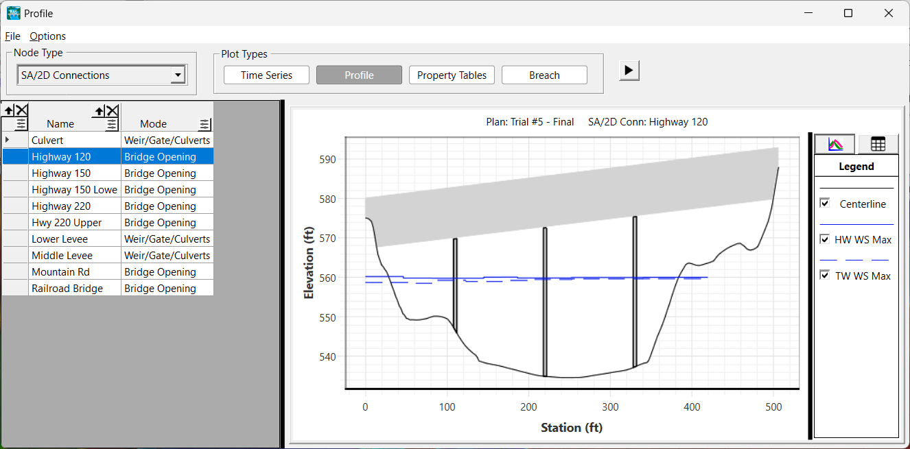 The bridge plot shown in the figure below is the standard Stage and Flow Hydrograph plot with the SA/2D Connection Profile plot.