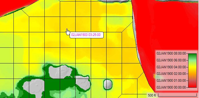 The Arrival Time result map is computed either with hours or days from a simulation start time. Use this option if you would like to display the arrival date/time when hovering mouse cursor over the Arrival Time map. As shown in the example below, the map legend will also be shown using data/time.