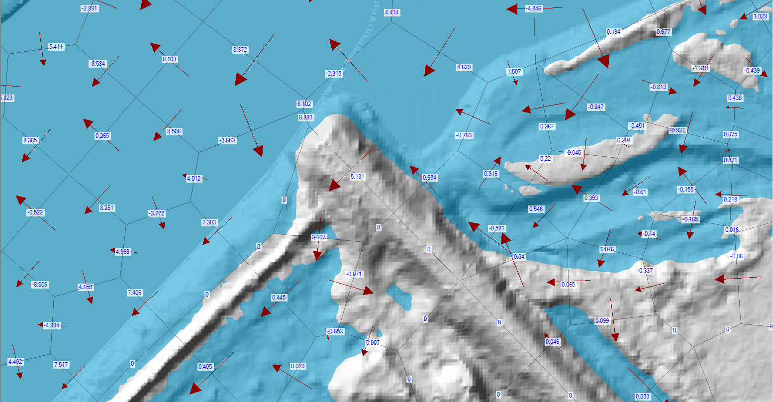 In the example below, the water surface elevations are plotted to quickly see that the water surface is lower that the high ground elevation for the surrounding levee. This allows the modeler to more quickly identify a mesh (cell face) problems.