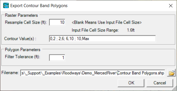 The As Contour Band Polygons option allow to generate vector contour bands at a specified contour Contour Value. Data is entered by specifying a lower and upper band with each band separated by a semicolon (";") (e.g. 0,2; 4,10; 10,Max). The keyword Max is used to include the maximum value in the dataset. Using the base data may result in long processing times (without improving output), therefore, you may want to resample the base map prior to contouring the data. Provide a value for the Resample Cell Size entry (if you leave it blank the export will use the base cell size from the RAS Terrain). Providing a Filter Tolerance will remove redundant points. The Contour Polygon Bands dialog is shown below.