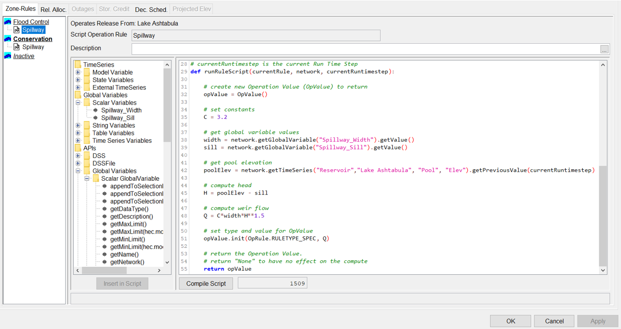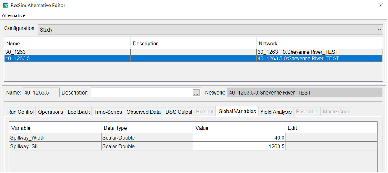 The previous example used a time series for the March 1st SWE total because the SWE needed to vary from year to year. If you only need to store a single value, you can use a Scalar global variable. This is particularly useful when multiple rules, state variables, etc. rely on the same constant, but you want to be able to change the value of that constant in the alternative editor. An example where this might be useful is a spillway study. You've set up a scripted rule to compute the discharge over the spillway, but you want to set up different alternatives that vary the spillway width and sill elevation. Instead of creating multiple networks or operations sets, each with different width and sill elevations hard-coded into the scripted rule, you can create a global variable for the spillway width and a global variable for the sill elevation. If the scripted rules reference the global variables, their values can be changed in the Alternative Editor, and all of the analysis can be done with a single network. The screenshots below show the setup for the scripted rule and two example alternatives, each with different values set for the Spillway_Width and Spillway_Sill on the Global Variables tab of the Alternative Editor.