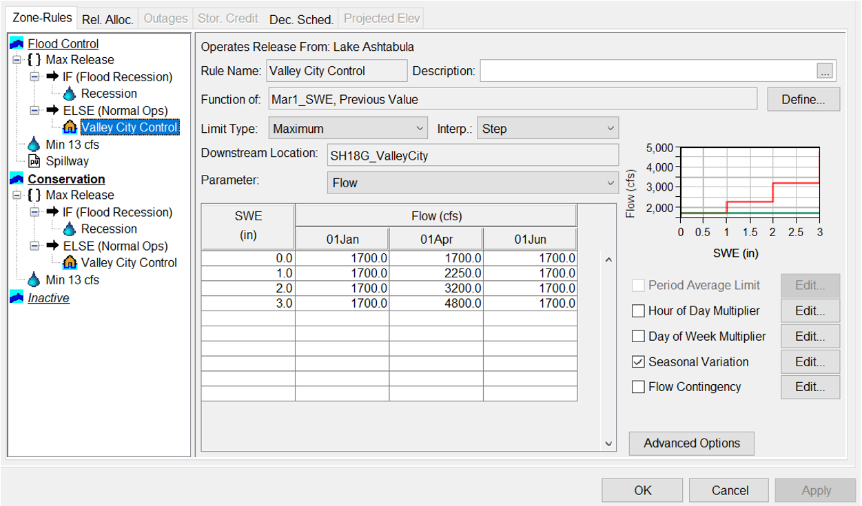 Since the March 1st SWE total is stored within a global variable, it can also be used to define operating rules. In the example below, the downstream control rule "Valley City Control" was based on the the March 1st SWE value. Higher SWE values allow for higher flows at the downstream location during the months of April and May.