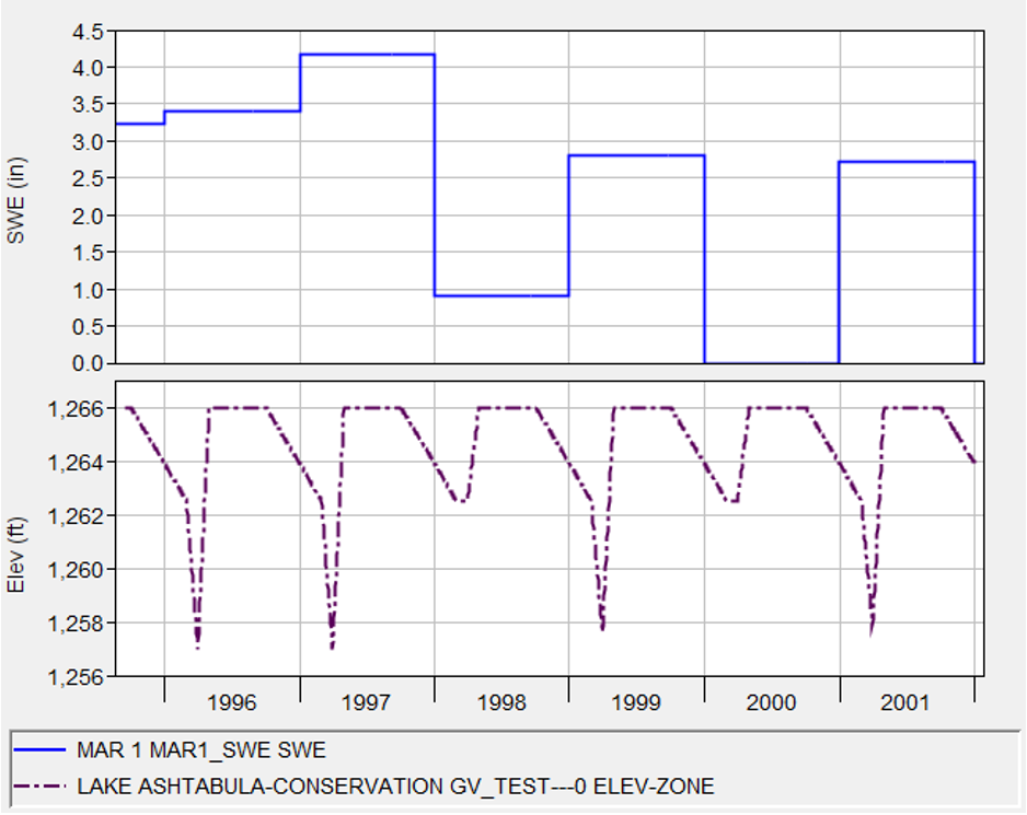 In the Reservoir Editor, the Conservation Zone at Baldhill Dam was set to be a function of Date and the Mar1_SWE global variable. Four different drawdown scenarios were defined, one for 0 to 1 inch of SWE, one for 1 to 2 inches of SWE, and one for 2 to 3+ inches of SWE. The screenshots below show the Conservation zone elevation function, as well as a plot showing the value of the Mar1_SWE global variable and the computed Conservation zone elevation.
