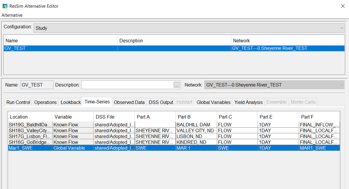 The value of the Mar1_SWE global variable was set in the Alternative Editor. Since the global variable is a time series, it appears on the Time-Series tab of the Alternative Editor. Its value was set by navigating to a local DSS file, just like the other local flow time series used in the model. When extracted to a simulation, the time series will be pulled into the simulation.dss file along with the other time series in the Alternative Editor.