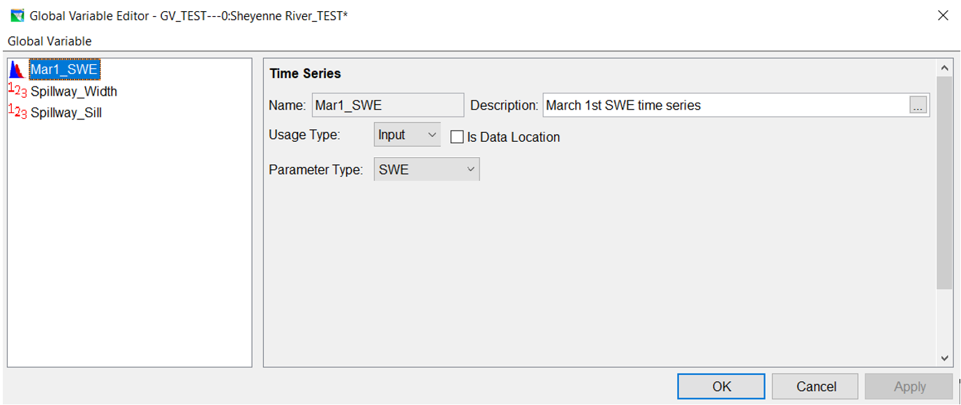 Operation of Baldhill Dam includes an annual, winter drawdown between October 1st and March 1st each year. If the snow water equivalent (SWE) is greater than 1 inch on March 1st, the reservoir is drawn down further to create flood storage for spring runoff. The drawdown can be modeled in ResSim using a Conservation zone elevation (guide curve) that is a function of Date and SWE. In this case, SWE was input into the model as a Time Series Global Variable. This was done by creating a time series global variable in the Global Variable Editor, as shown below. Since the value of the global variable will be set in the Alternative Editor, the Usage Type was set to Input.