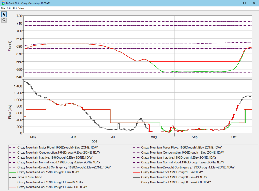 This simulation contains one alternative named 1996Drought using the Regulation Plan operation set. The simulation is defined from May 11, 1996 through October 30, 1996, with a lookback date of May 10, 1996. Time-series and simulation timestep are daily. The time-series of inflow to Crazy Mountain reach all-time crazy lows less than 200 cfs! Local flows at Villanova, Bethesda, and River Pointe are identical to the Crazy Mountain inflow, except the Villanova time-series is multiplied by a factor of 0.25. Local inflows at Rockville and Greenfield hover around 2,250 and 3,300 cfs respectively. Reservoir elevation starts at 676.8 feet (0.2 ft below top of drought contingency pool).