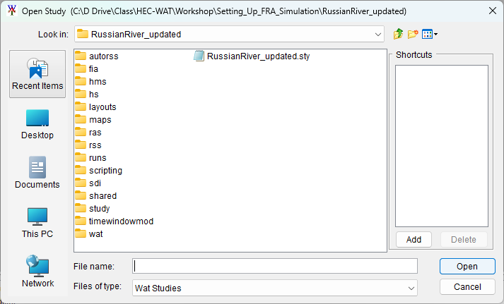 1. From the HEC-WAT menu, click File | Open Study. The Open Study dialog box will open. From the Open Study browser window, navigate to RussianRiver_updated.sty and click Open.
