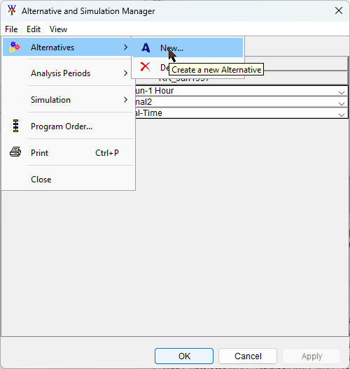 6. Click OK, the Create New Simulation dialog will close, and the simulation will be added to the table in the Alternative and Simulation Manager dialog box. Click Apply to add the simulation to the Study Tree.