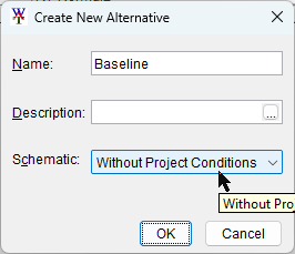- In the Name textbox, enter "Baseline", from the Schematic list select (Without Project Conditions), and click OK.