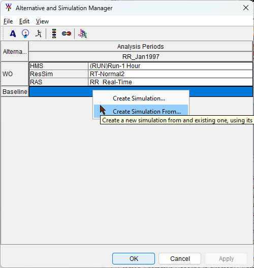 3. From the table, right-click on the intersection of an alternative Baseline and analysis period RR_Jan1997. From the shortcut menu, click Create Simulation From.