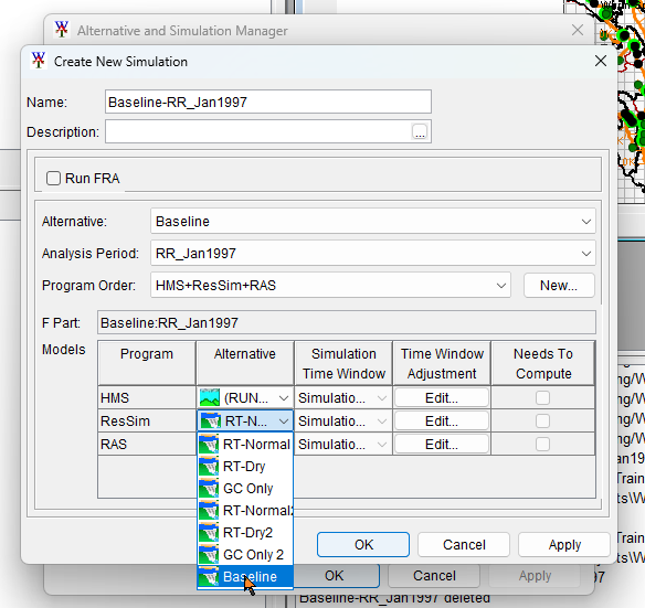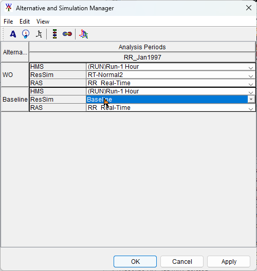 5. We will now modify the copied simulation to use the new Baseline HEC-ResSim model alternative. From the Alternative column, from the list for ResSim, select the (Baseline) alternative.