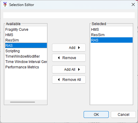 - Add HMS, ResSim, and RAS to the Selected column. Select OK to close the window.