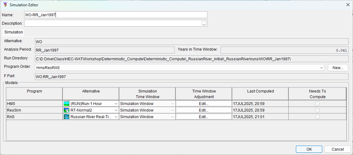 Now that all the building blocks have been configured (alternative, analysis period, program order, models), the user can now create an HEC-WAT simulation. To create an HEC-WAT simulation:
