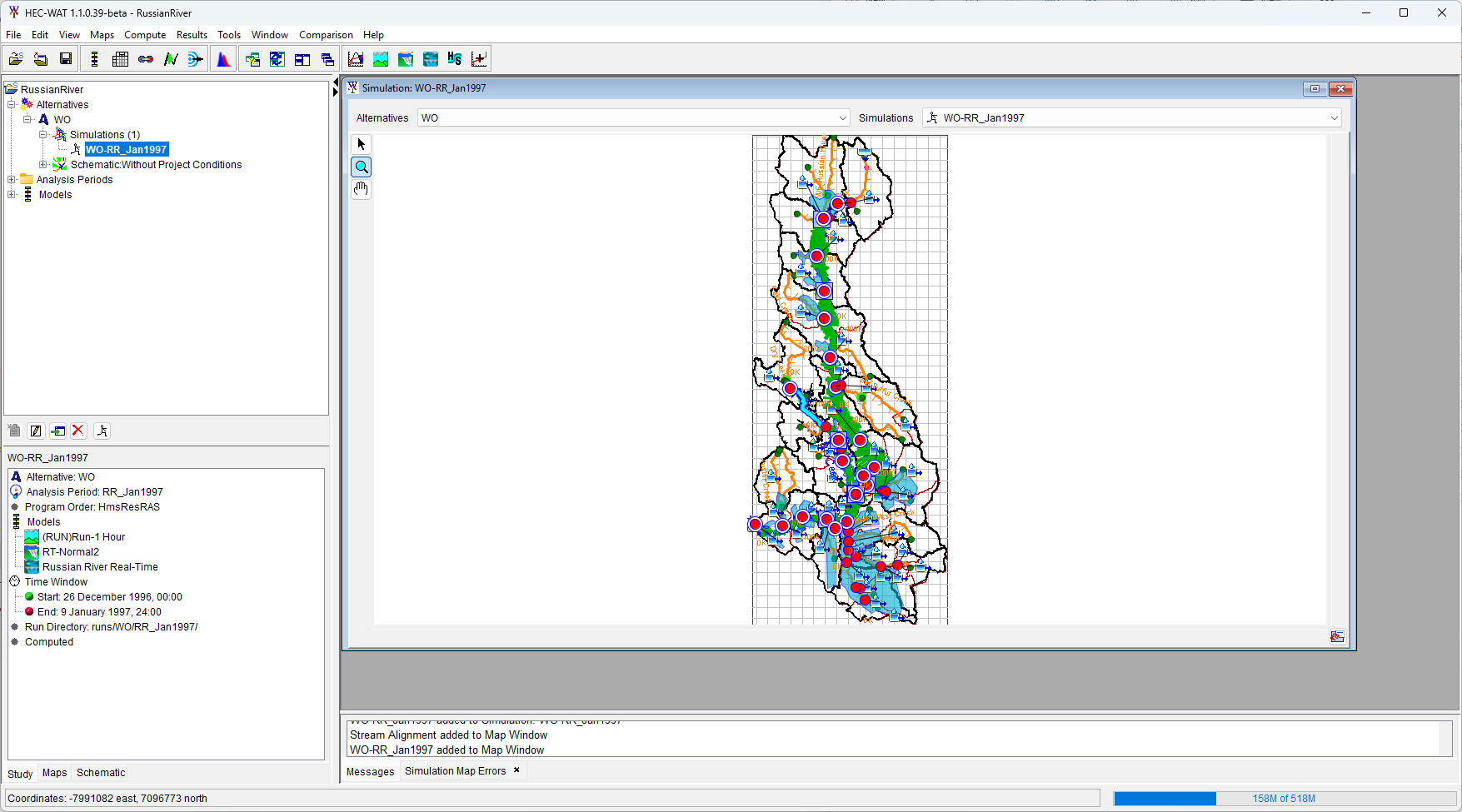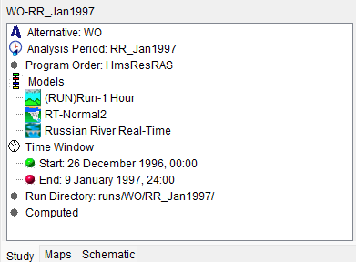 6. From the HEC-WAT main window, the created simulation appears on the Study Tree, under the Simulations folder, click on the simulation.