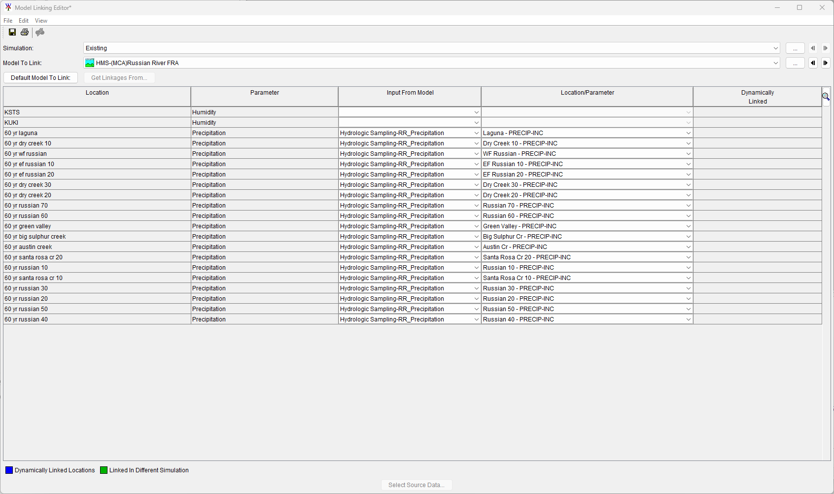 3. From the Model To Link dropdown select HMS-(MCA)Russian River FRA and the table should update, and it should be automatically linked to the Hydrologic Sampler. For this FRA simulation we do not need to change any of the automatic linking for the HEC-HMS model alternative. Leave the KSTS and KUKI blank.