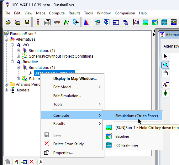 - Note, if dynamic linking is not used for the new Baseline simulation, then the RAS-Russian River model alternative will look for results from the ResSim-RT-Normal2 model alternative instead of the ResSim-Baseline model alternative during the compute.
