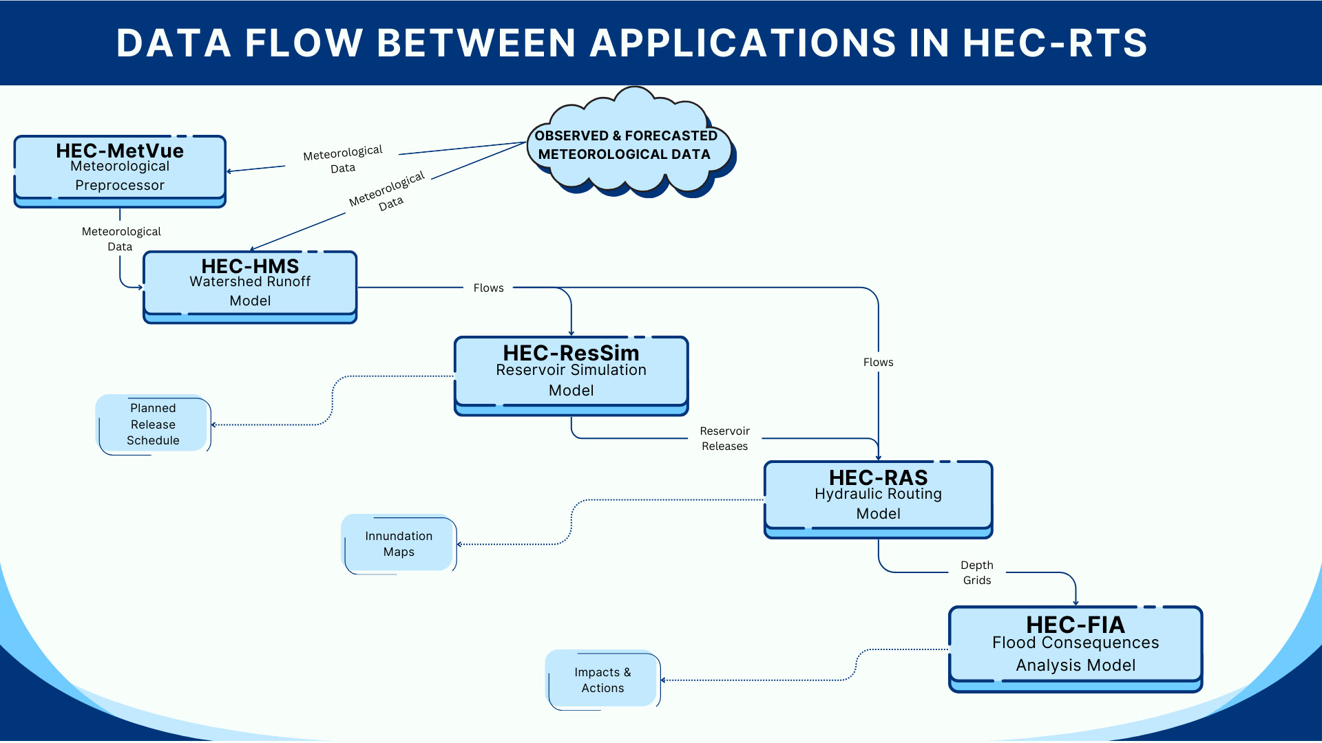 HEC-RTS provides support for operational decision making by forecast simulation modeling using any combination of the following models. Rainfall-runoff modeling with HEC-HMS based on gaged or radar-based